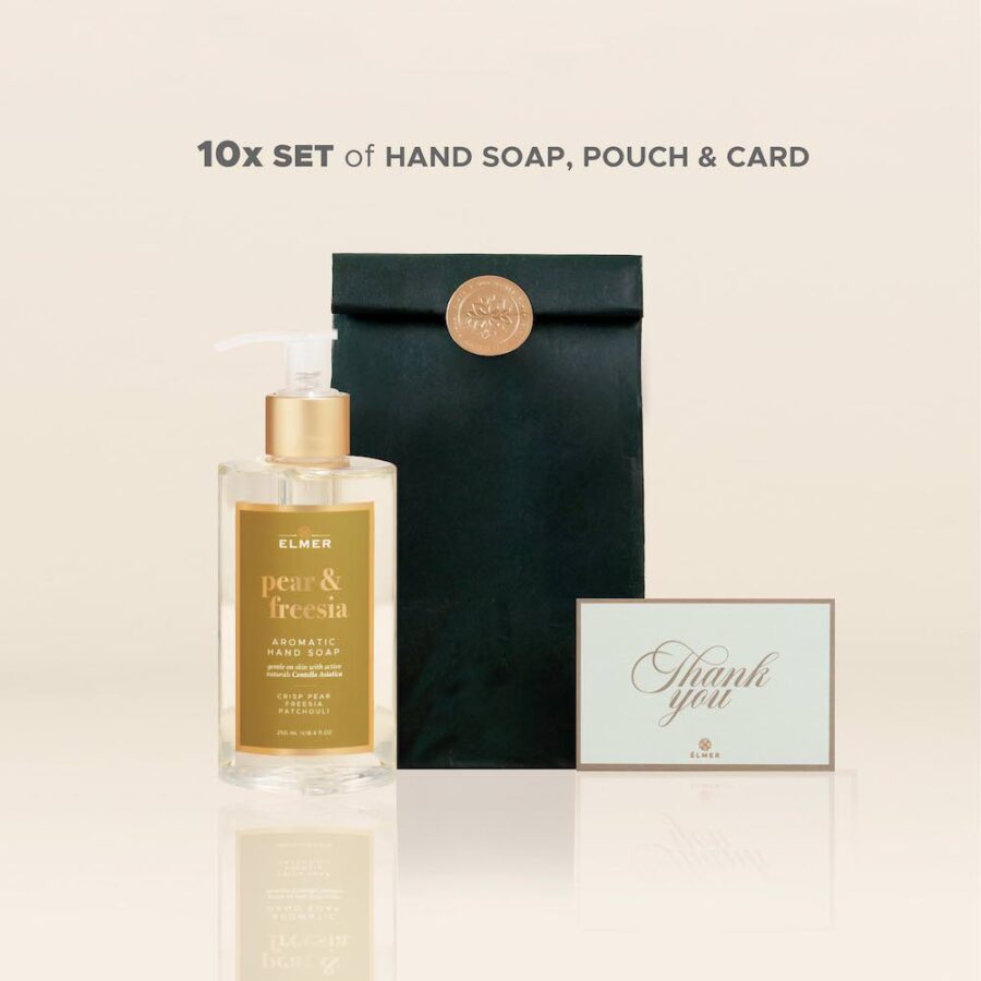 The perfect gift set for colleagues, friends, and big groups. Get the elegant look with best deal price. Each set includes 10 of your favorite hand soap, 10 cards of your choice, and eco-friendly Jade Paper Pouch. Finish it with our signature gold seal, and this package is ready for your loved ones.